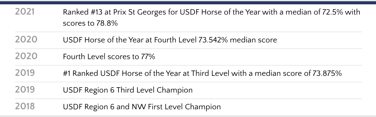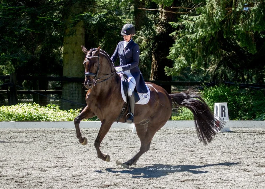 In 2021, he debuted at Prix St George and Intermediate I, hitting the phenomenal score of 78.8% in his second show. He is one of the most phenomenally talented horses that Alyssa has ever ridden, and it is with excitement that we wait to see what the future holds for this very talented horse.